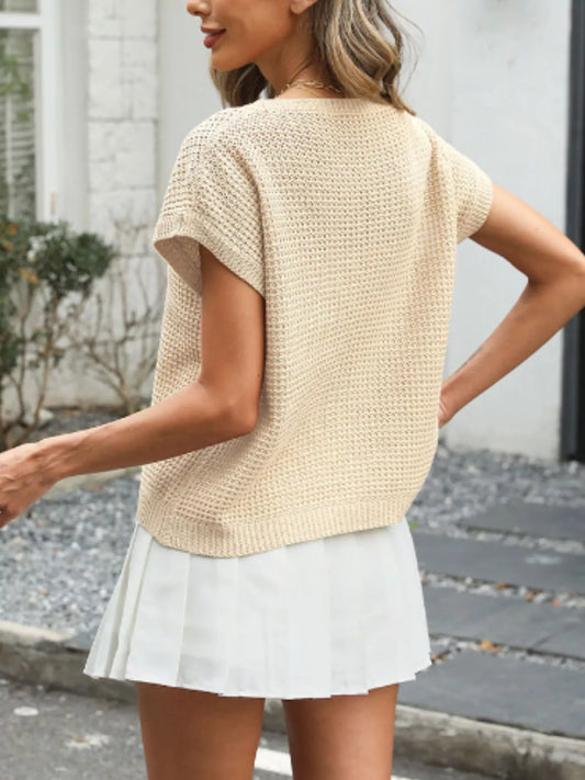 Openwork Round Neck Cap Sleeve Casual Knit Top