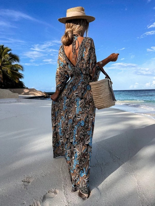 Summer Printed Halter Dress Fashion Boho Backless Ruffled A-Line Beach Dresses For Womens Clothing