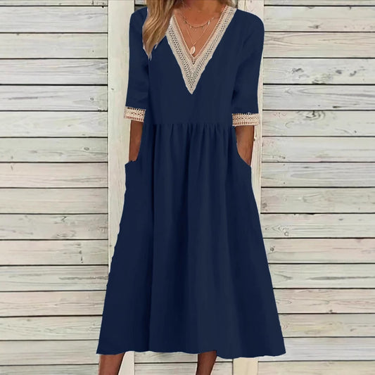 Cotton And Linen Lace Collar Half Sleeve Mid-length Dress