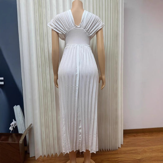 V-neck Sexy Bat Sleeve Slim-fit Pleated A- Line Dress