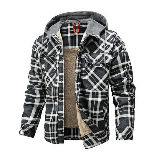 Men Warm Jacket Fleece Lining Lumberjack Plaid Hooded Jackets Snap Button