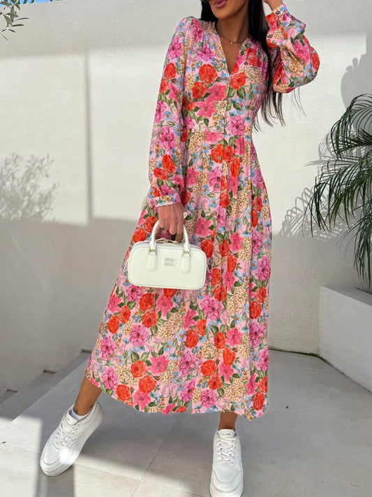 Floral Print Long Sleeve V-Neck Dress