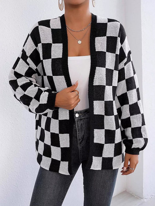Checkerboard Pattern Open Front Knit Cardigan