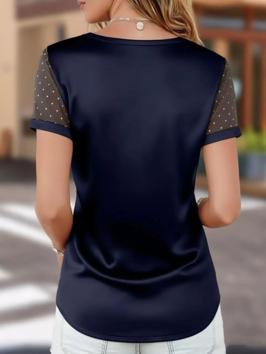 Polka Dot Mesh Sleeve Satin Short Sleeve Top