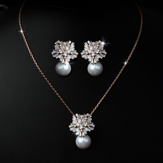 Korean temperament luxury high-grade pearl necklace earrings set with zircon jewelry micro all-match fashion bride