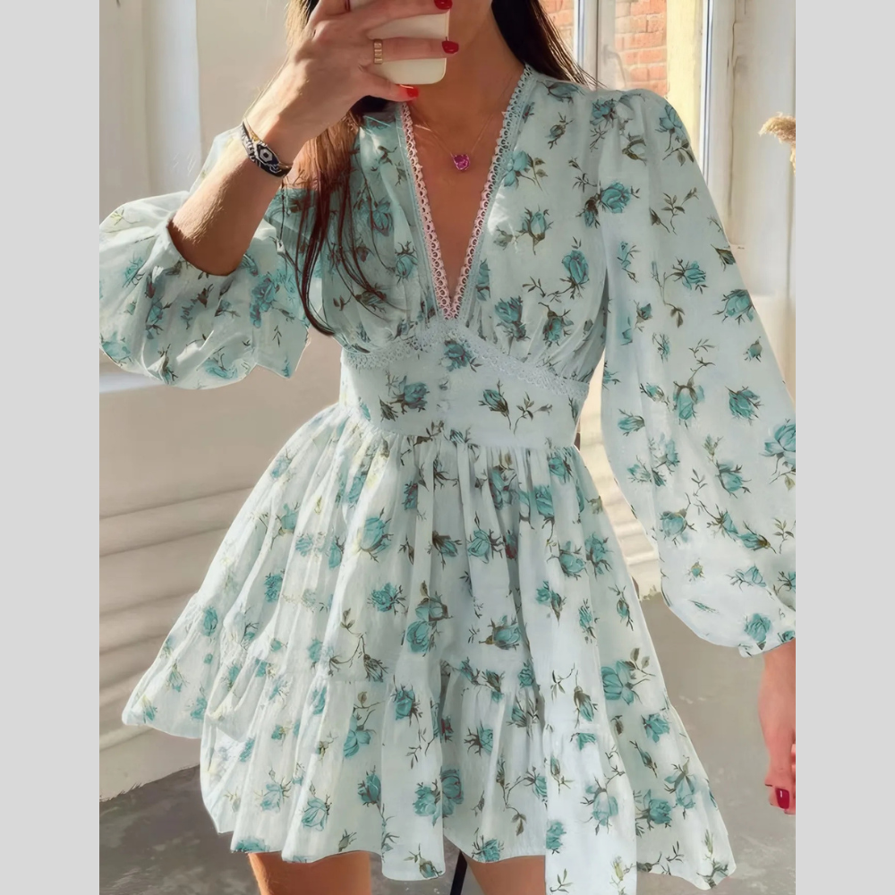 Full Size Floral Print Lace Detail V-Neck Mini Dress Plus SIze