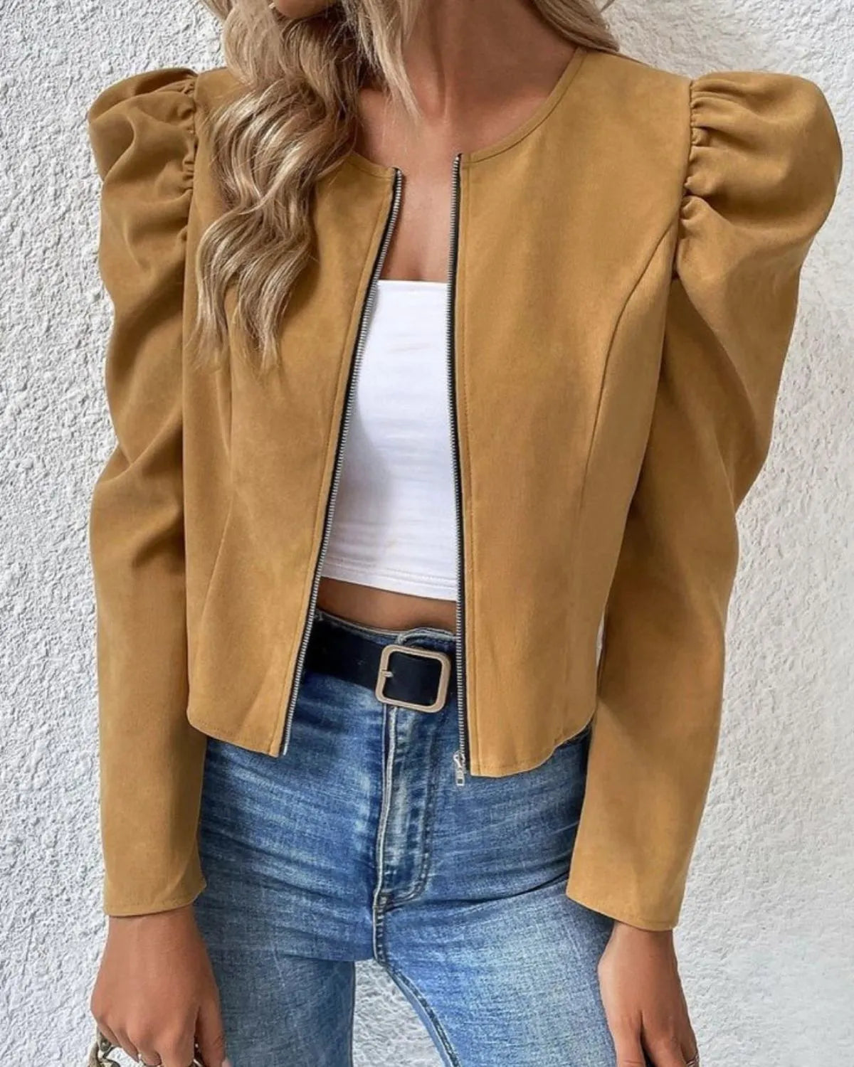 Round Neck Cardigan Zipper Bubble Long Sleeve Coat Women's Clothing