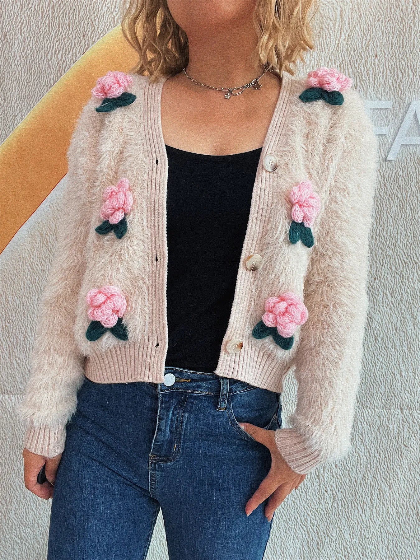 Stitching Three-dimensional Flower Fashion Short Knitted Sweater