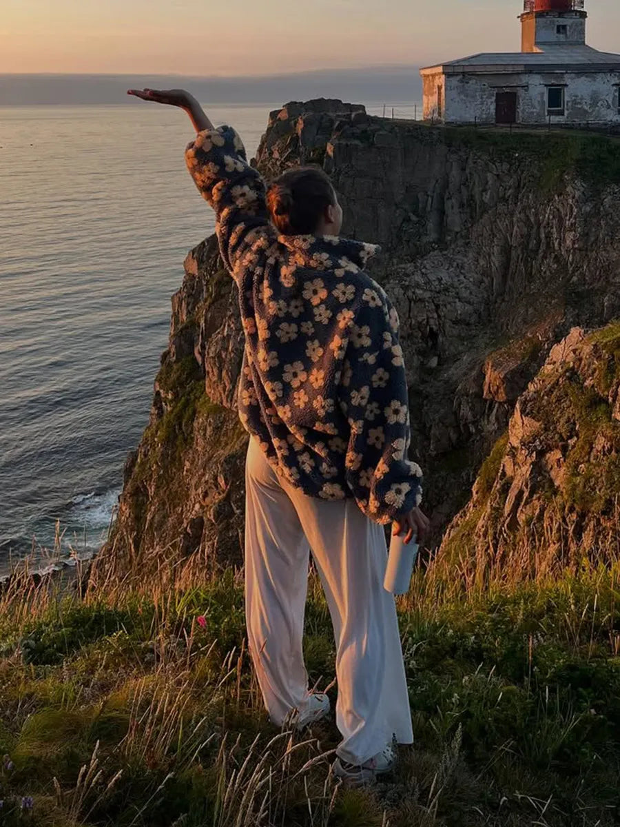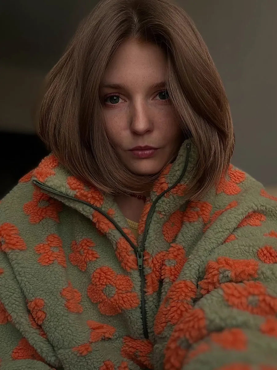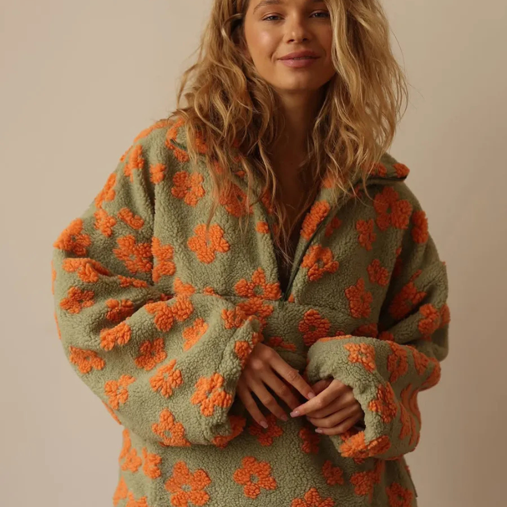 Winter Flowers Lambskin Sweatshirt With Big Pocket Casual Loose Zip-up Lapel Pullover Top Women's Clothing