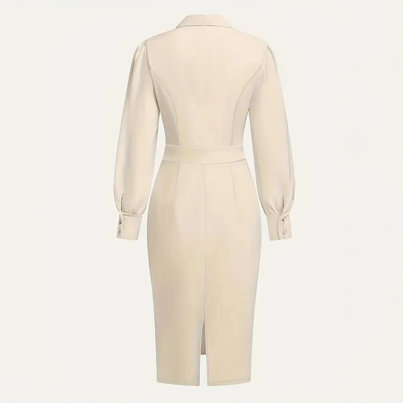 This exquisite dress features a structured stand collar that frames the neckline elegantly, complemented by artful pleating and a delicate bow detail that adds feminine grace. The strategic hem slit offers a modern touch while maintaining professionalism, and the tailored silhouette skims the body flatteringly. Crafted from 100% high-quality polyester , this dress provides exceptional drape and wrinkle resistance, ensuring impeccable appearance throughout your day. The long sleeves and knee-length design create polished elegance perfect for formal occasions. The hidden back zipper delivers seamless closure while preserving clean lines. Available in sizes S-XXL to ensure perfect fit for various body types.
